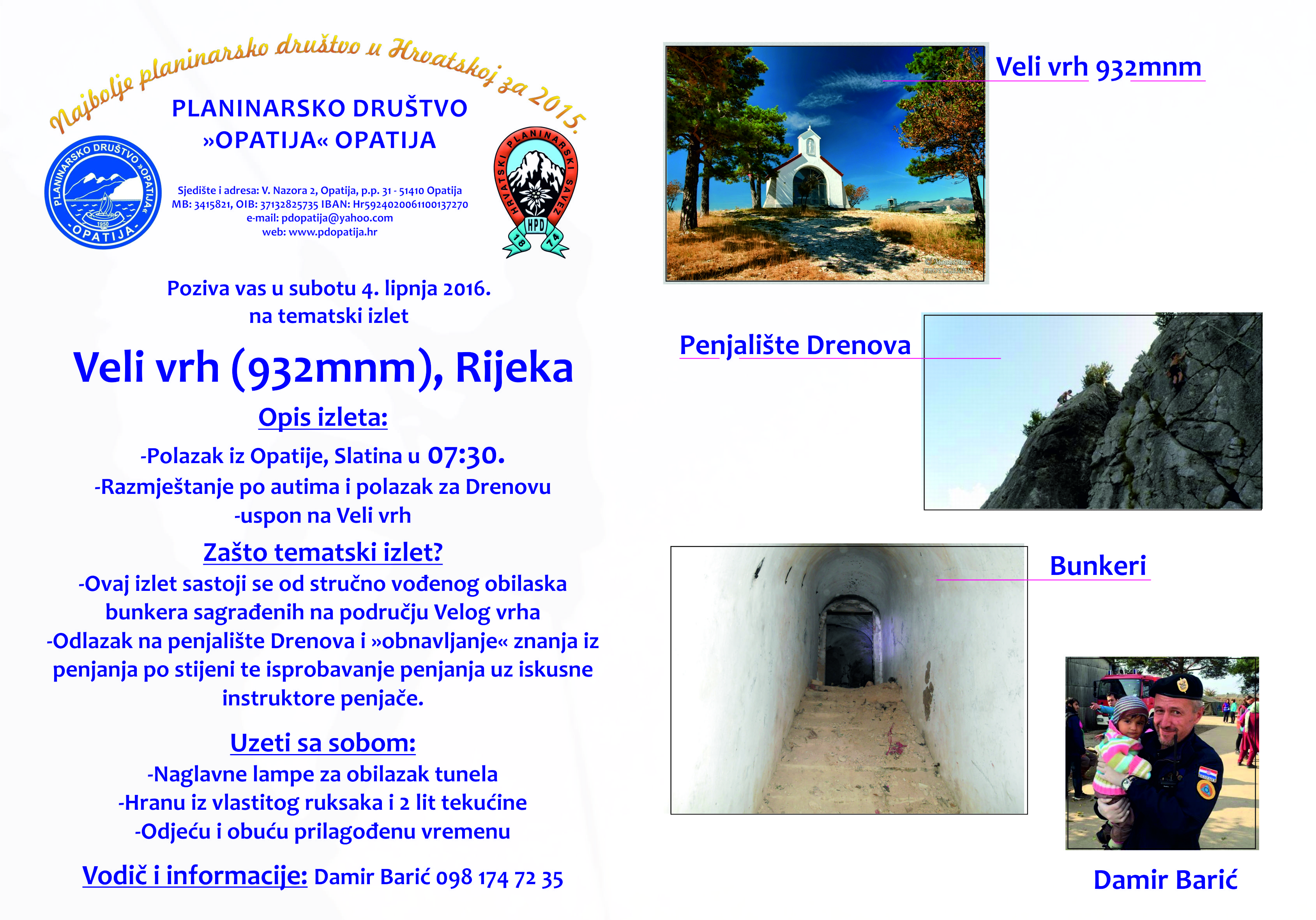 Planinarsko društvo "Opatija" poziva vas na tematski izlet na Veli vrh, koji će se održati u subotu 4. lipnja 2016. Više informacija možete pronaći ovdje.